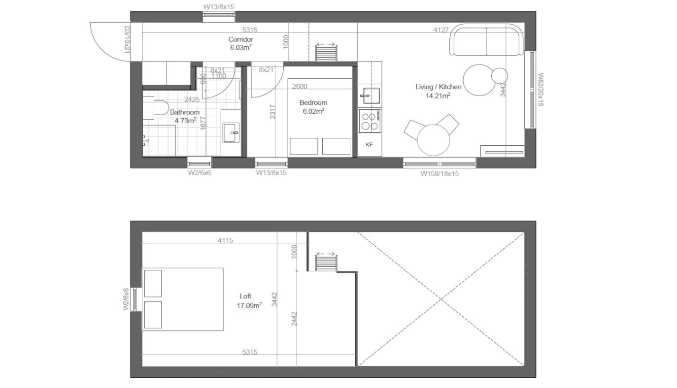 All houses and floor plans are unique. Our two-story/loft models always include a white painted staircase or loft ladder. You can choose between different designs for an additional fee. Ask your salesperson which stairs work for your particular model.